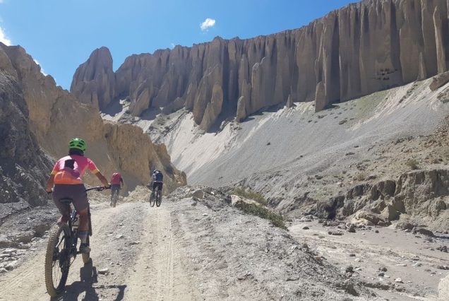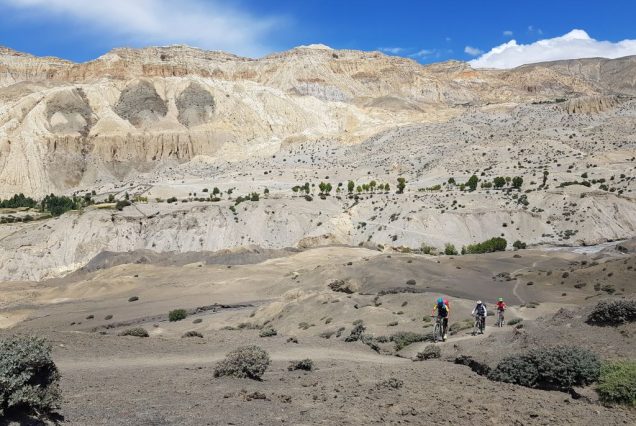 This day is not as hardest as upper trails as we don’t have long climbing and high Altitude but some of the climb still killer as we already tired from the past one! This day also we will be leaving Upper Mustang restricted area and riding lower Mustang. First 3 km from the Chele will be down and flat to the Chhusang betwin this 3 km we are crossing metal bridge where we can see river is coming through nature tunnel, after Chhusang the trails will be up and down till Kagbeni through the village call Tangbe, from the Kagbeni we will be again riding in Kali Gandaki riverbank which is flat but very strong head wind all the way to Marpha!
